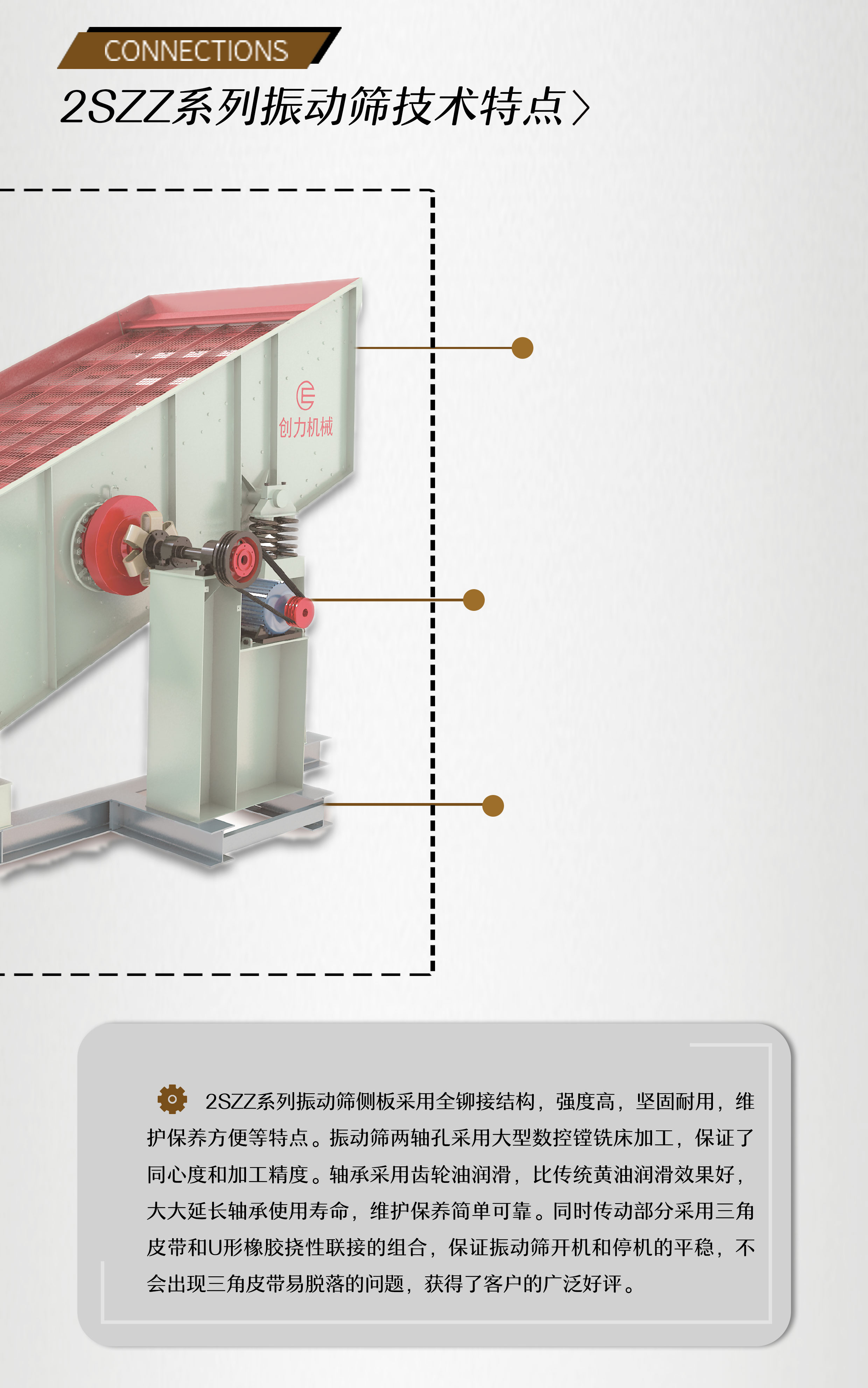 2SZZ系列振動篩側(cè)板采用全鉚接結(jié)構(gòu),強(qiáng)度高,堅(jiān)固耐用,維護(hù)保養(yǎng)方便等特點(diǎn)。振動篩兩軸孔采用大型數(shù)控鏜銑床加工,保證了同心度和各部位的加工精度。軸承采用齒輪油潤滑,比傳統(tǒng)的黃油潤滑效果好,大大延長了軸承使用壽命,維護(hù)保養(yǎng)簡答可靠。同時(shí)傳動部分采用三角皮帶和U形橡膠撓性聯(lián)接的組合,保證振動篩開機(jī)和停機(jī)的平穩(wěn),不會出現(xiàn)三角皮帶易脫落的問題,獲得了廣泛的應(yīng)用。