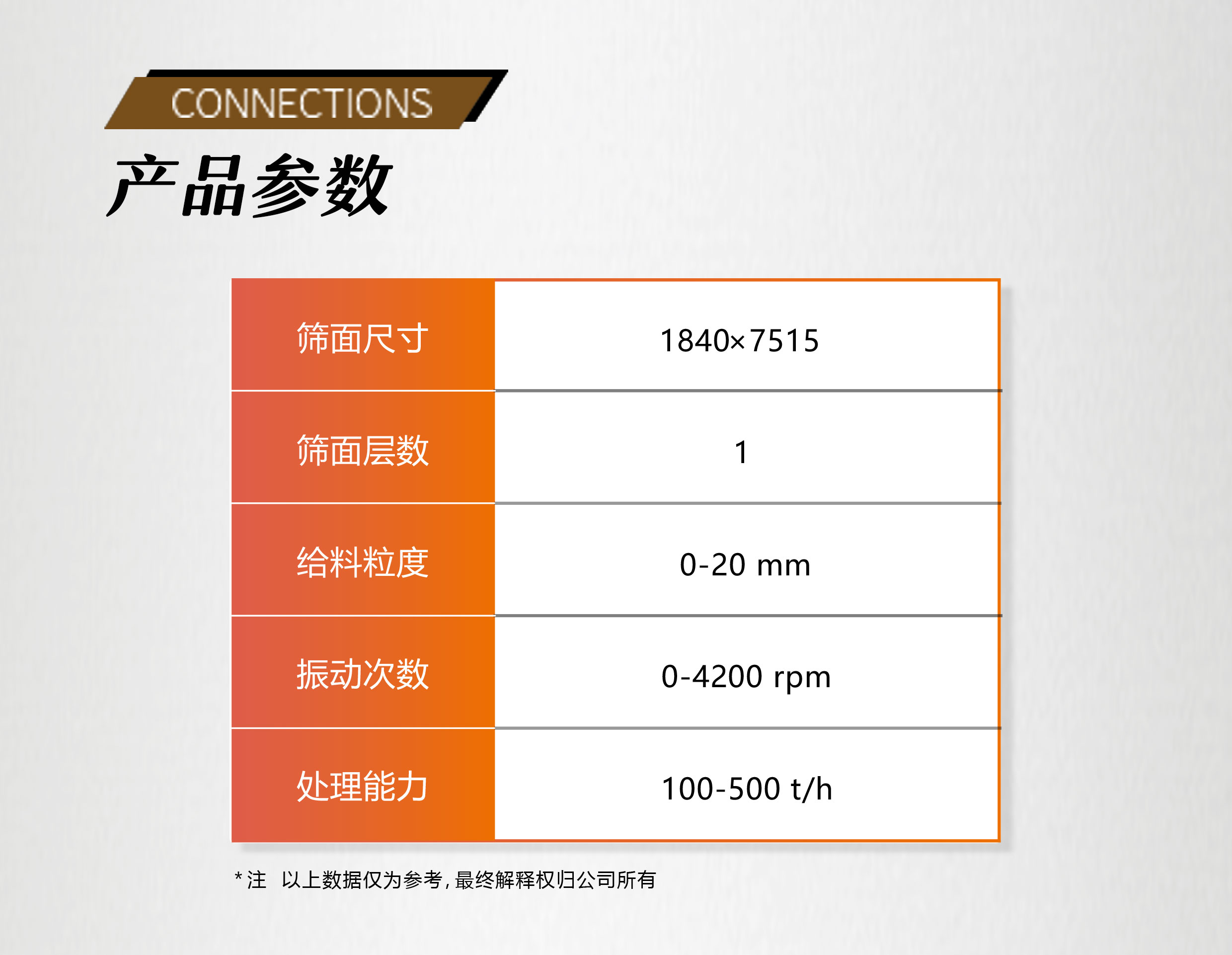 篩面尺寸 1840x7515 篩面層數 1 給料粒度 0-20mm 振動次數 0-4200rpm 處理能力 100-500t/h