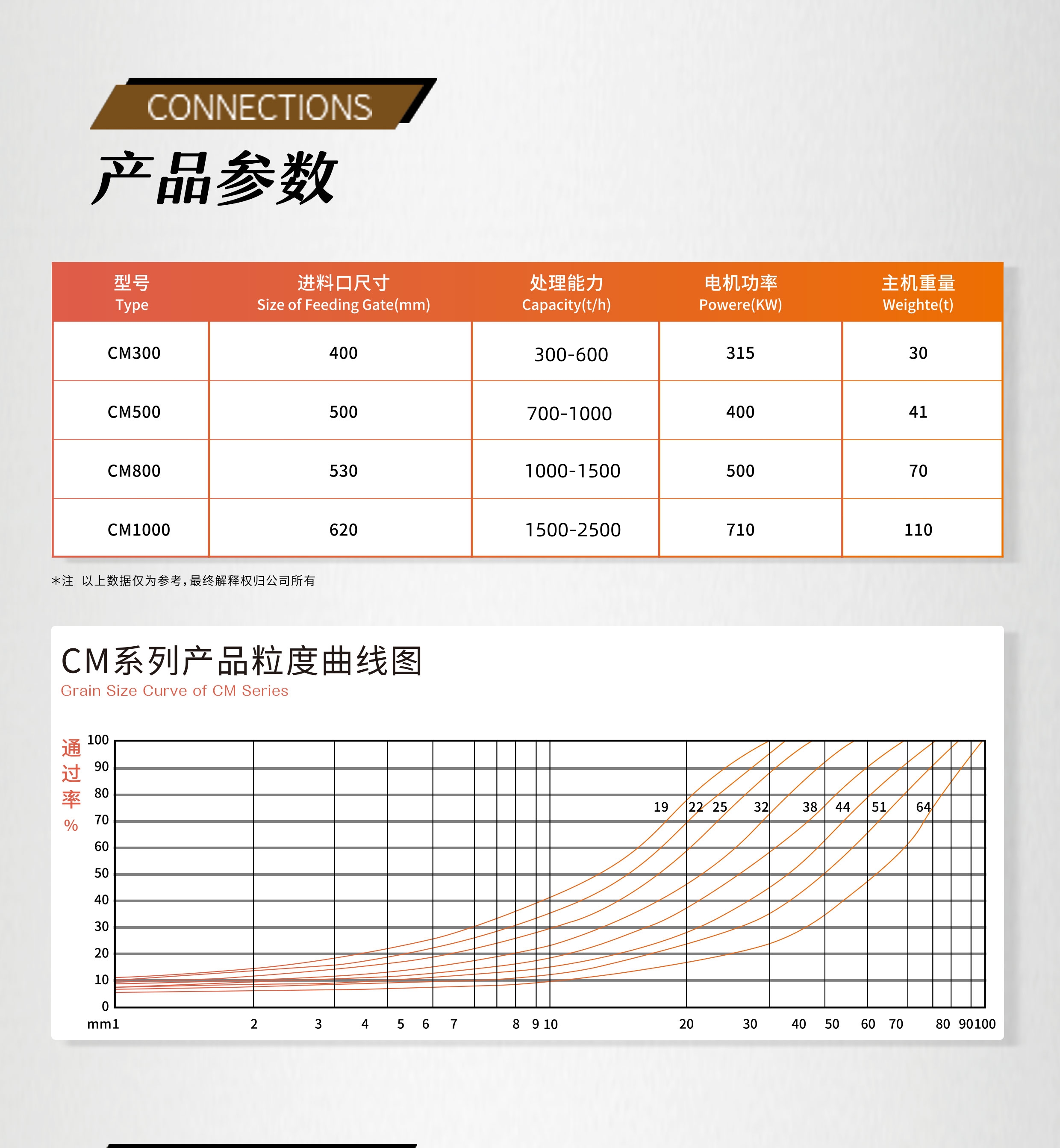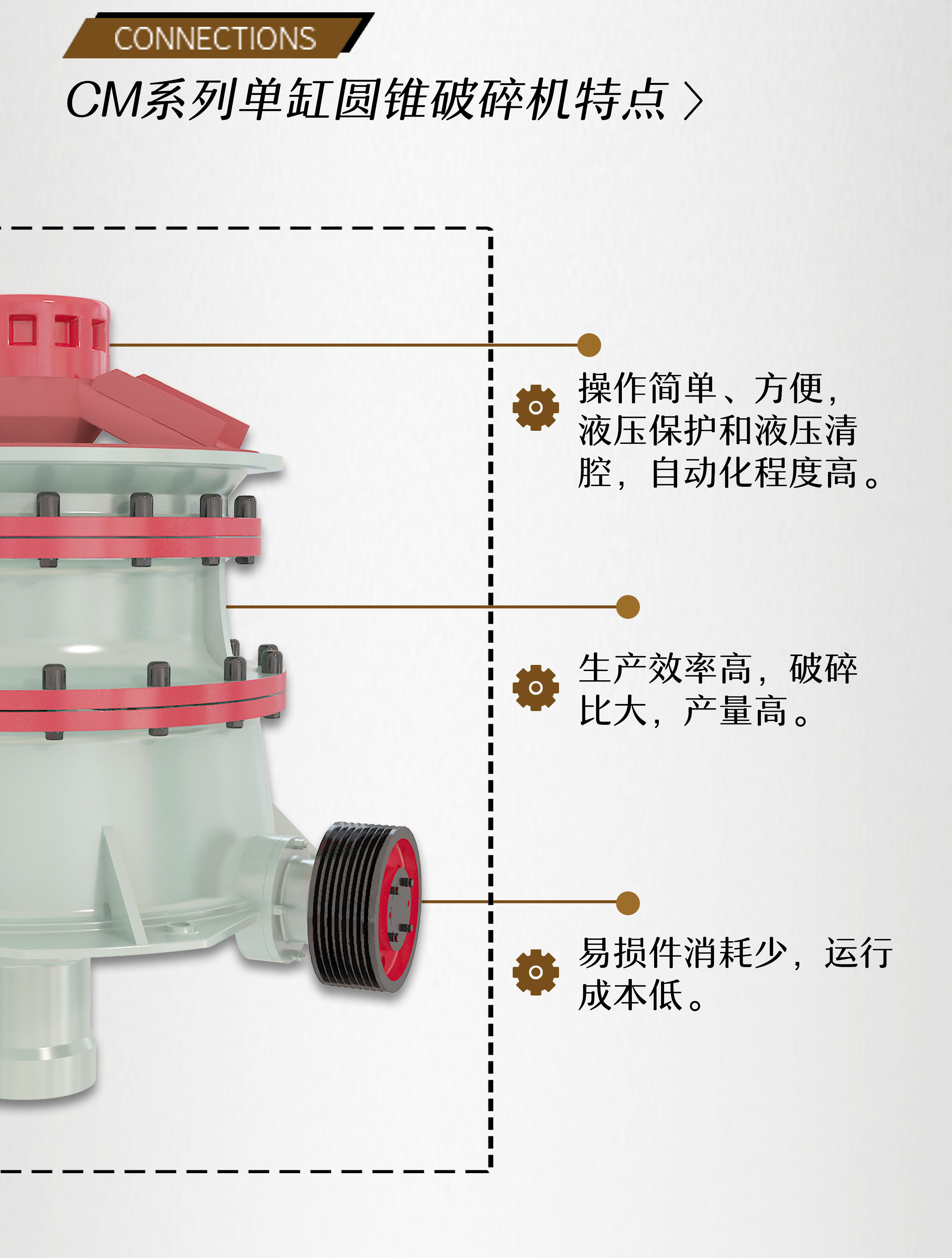 CM系列單缸圓錐破碎機設計先進、結構緊湊、破碎能力強、破碎比大、是中碎機型的最佳選擇。其緊邊排料口通過液壓調整,較易達到理想的排料口大小,且易于使用、維護,作業效率高。 破碎機內部結構密封有效地保護設備避免受粉塵及其他細小顆粒的侵害,減少了維護工作量,進一步提高了破碎機的使用壽命。